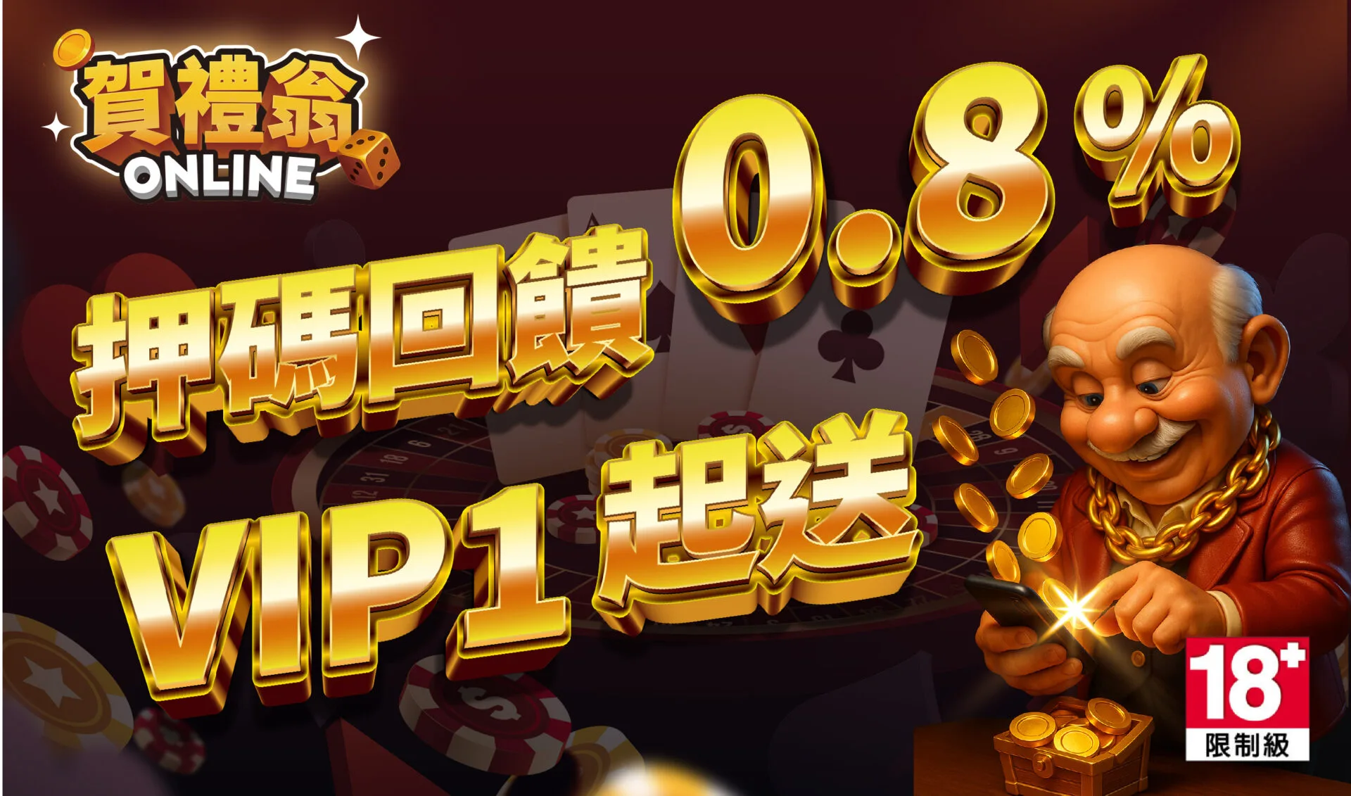 活動自即日起,玩家達成 VIP1 等級即可享有 押碼 0.8% 回饋。 所有回饋將依系統結算,自動派發至您的帳號。 請使用官方授權之方式參與活動,以確保回饋正確入帳。 賀禮翁Online祝您遊戲順利、好運加倍!